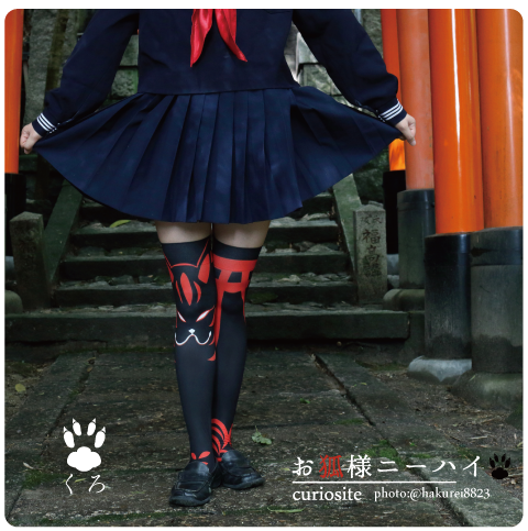 お狐様をイメージしたニーハイです。左足にお狐様、右足に鳥居、足先には九尾の尻尾をイメージしています。