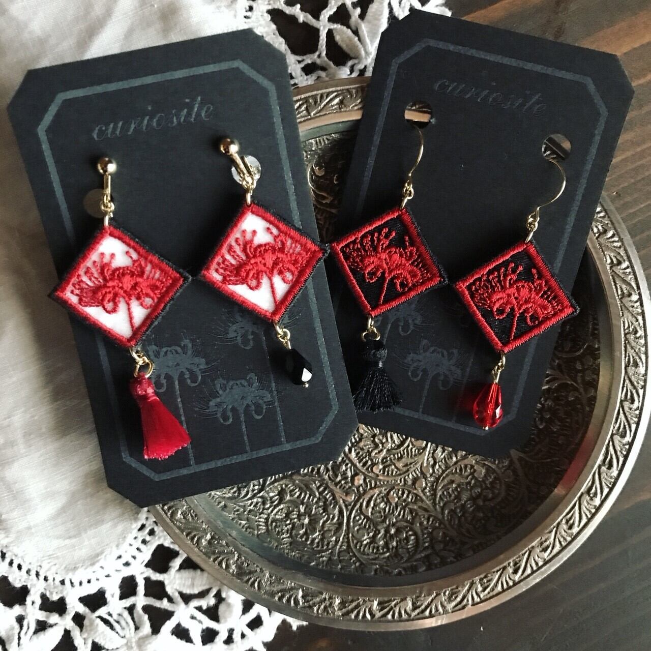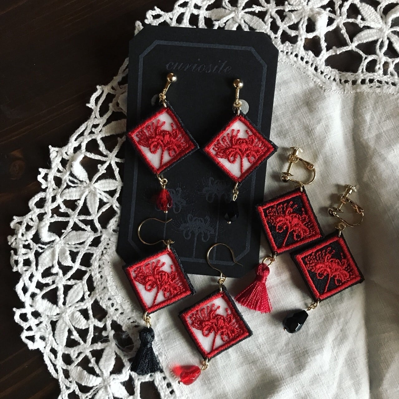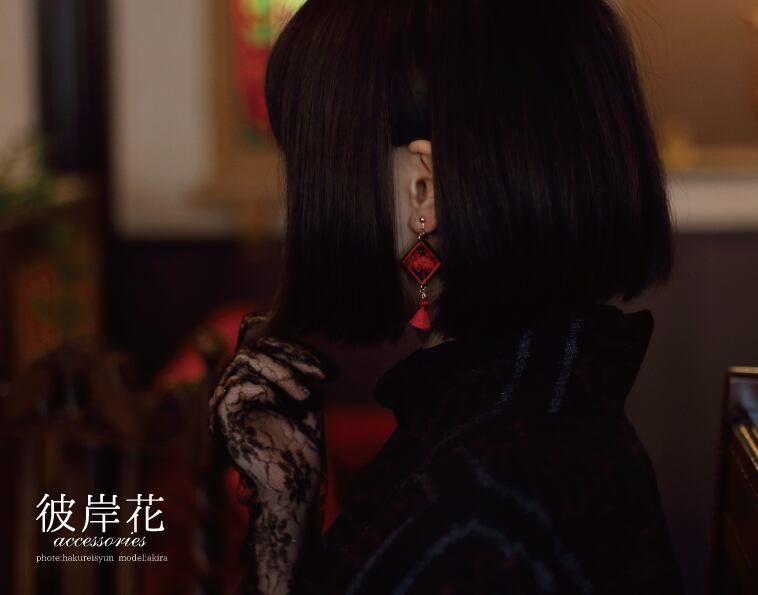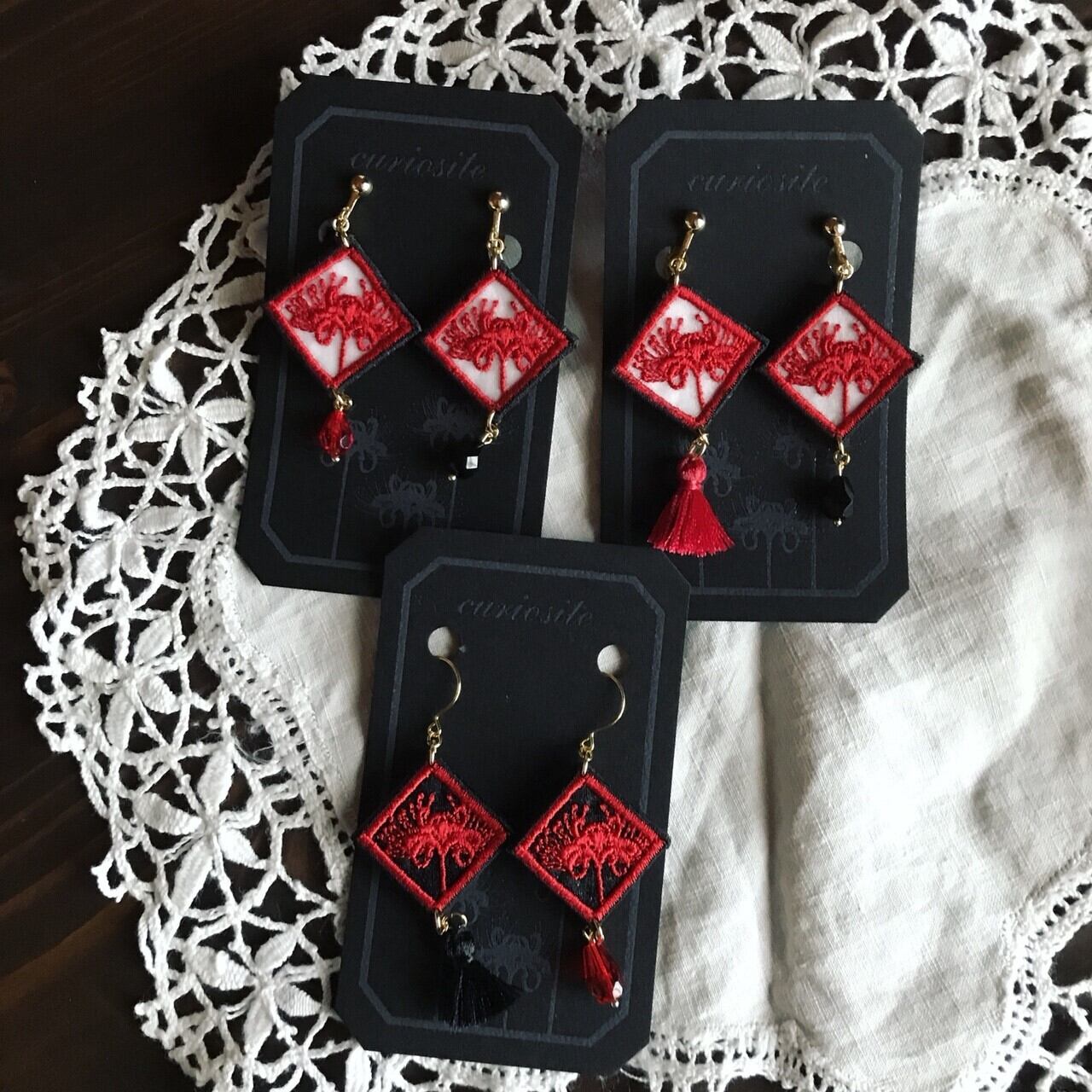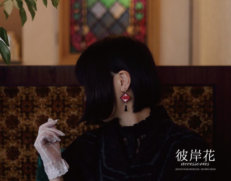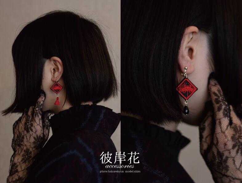 彼岸花を刺繍したアクセサリーです。三センチの正方形で、オーガンジーに細やかな刺繍がされています。