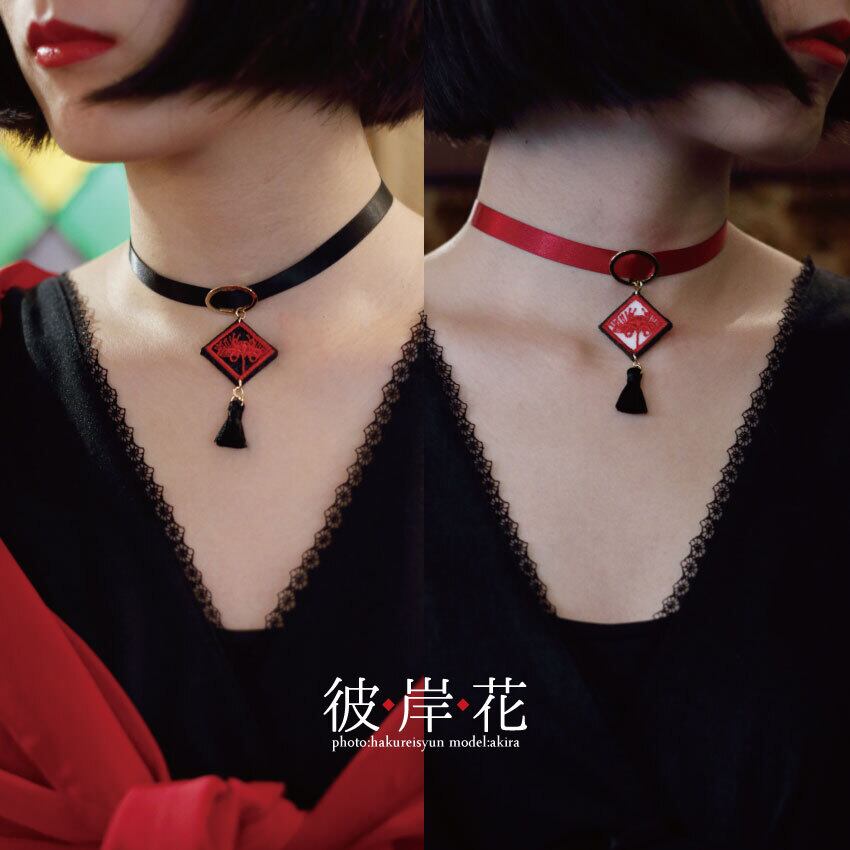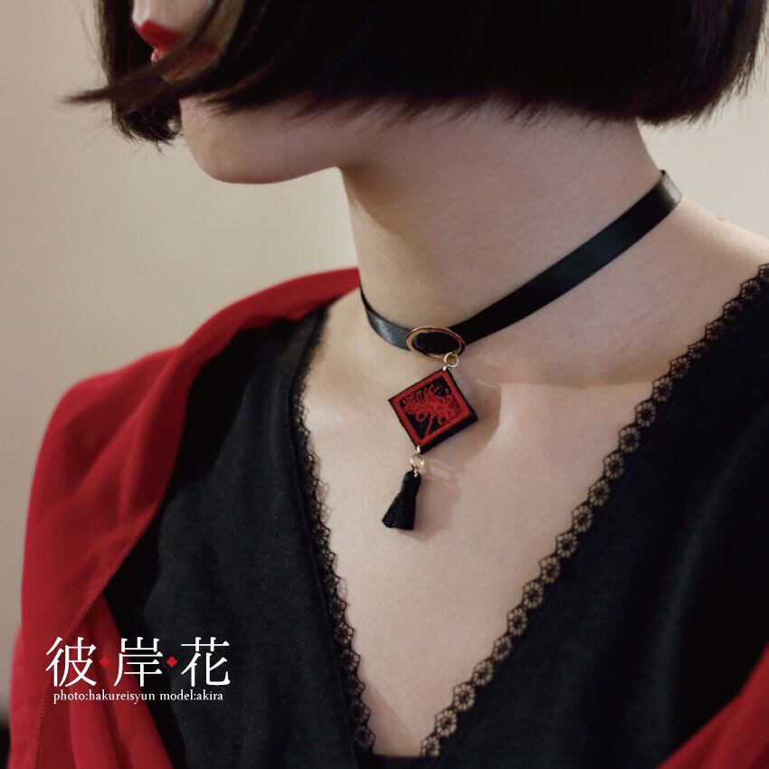 黒刺繍と黒いリボンとの組み合わせは大人っぽくシックな雰囲気です。首元に小さな彼岸花を