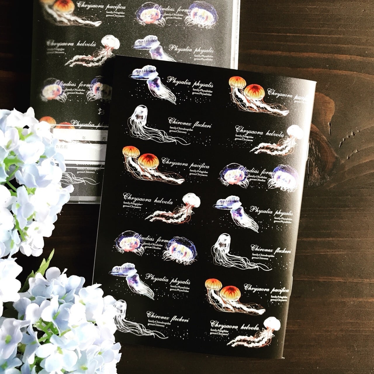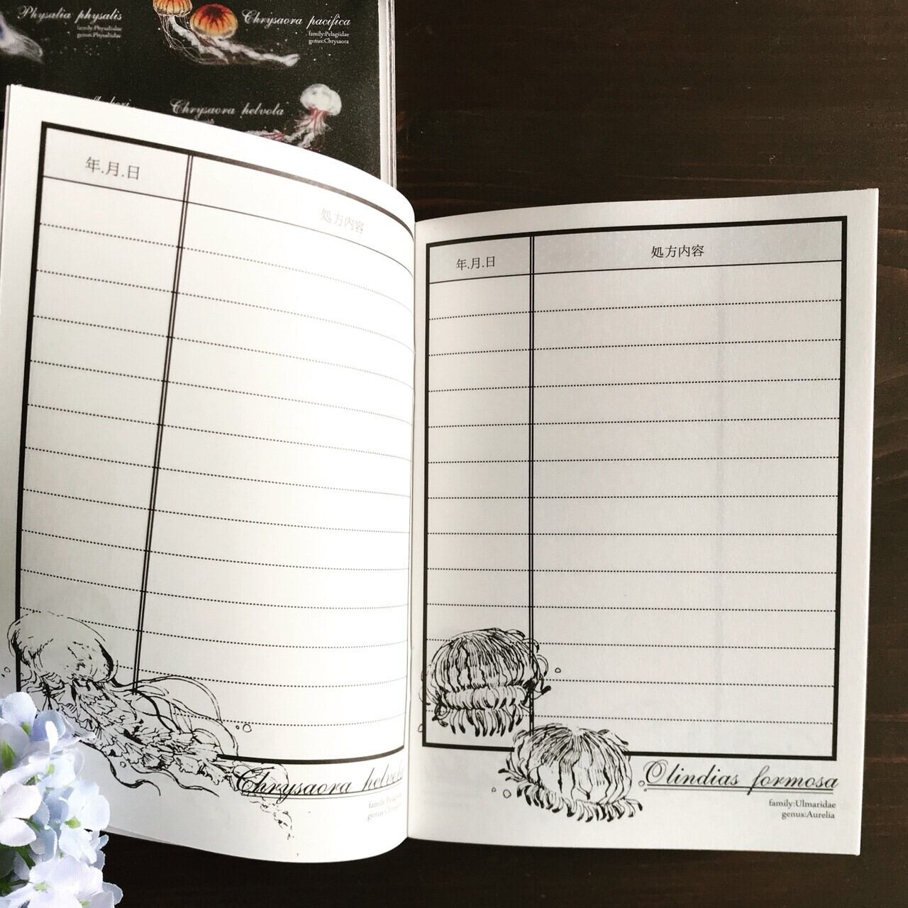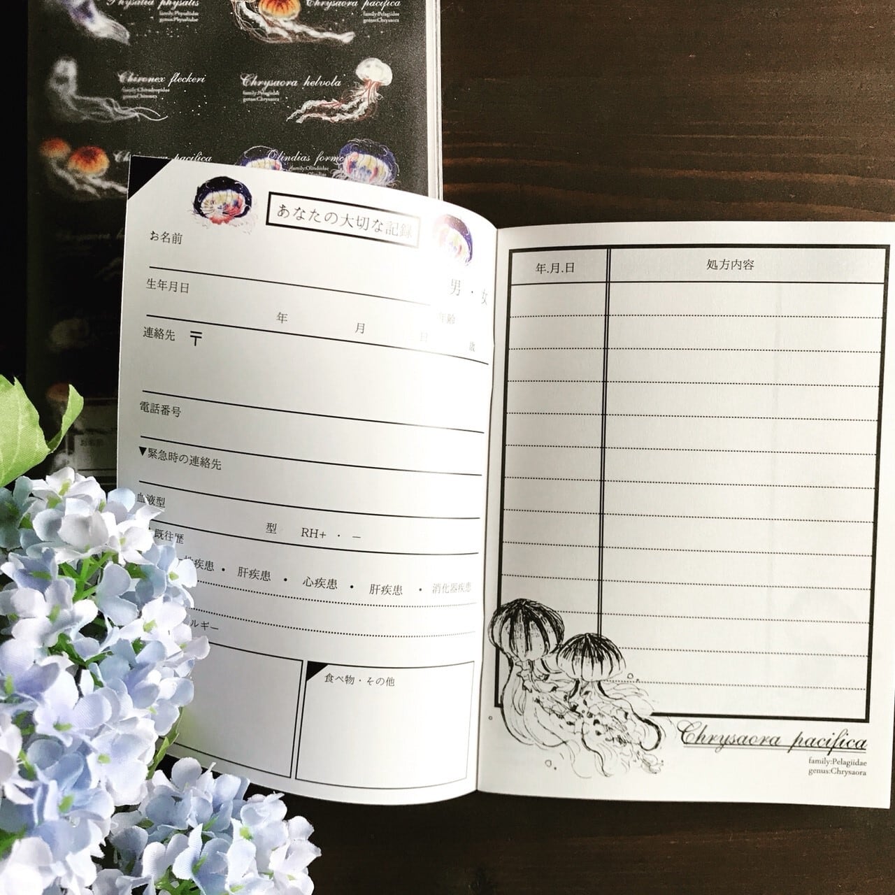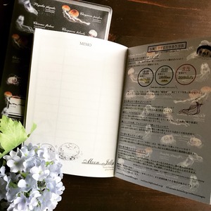オリジナルのお薬手帳です。 こちらは毒を持つクラゲをモチーフにしています。 表紙は黒くシックな雰囲気で男女問わず使えます。 中身にもこだわり、描き下ろしで数種類のクラゲの絵が描かれています。 市販のお薬手帳とは違うものを使いたい方にオススメ◎ 冊子を包むビニールカバーには診察券等が入るポケットが二つ付いています(半透明タイプです 表紙含め36ページ A6サイズ