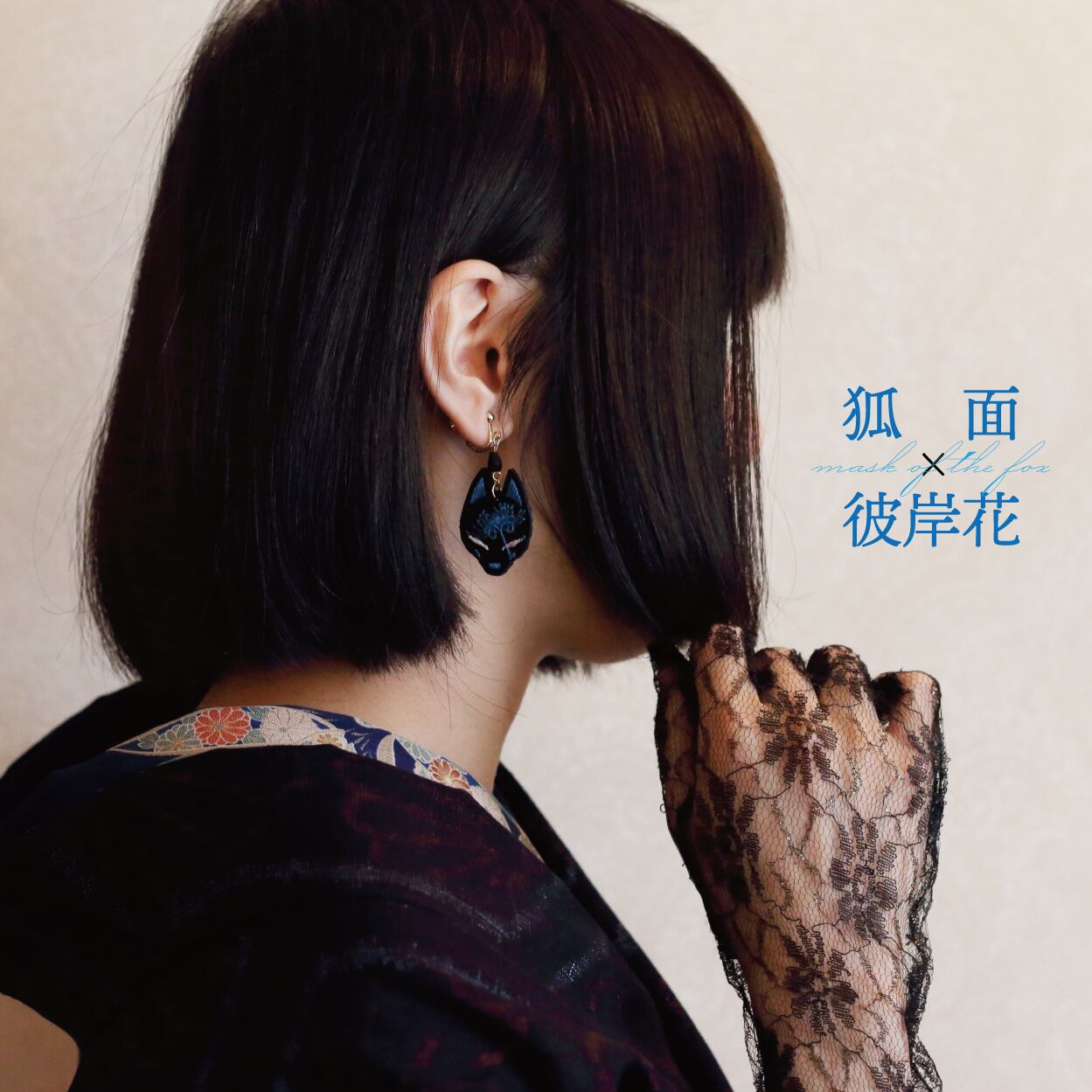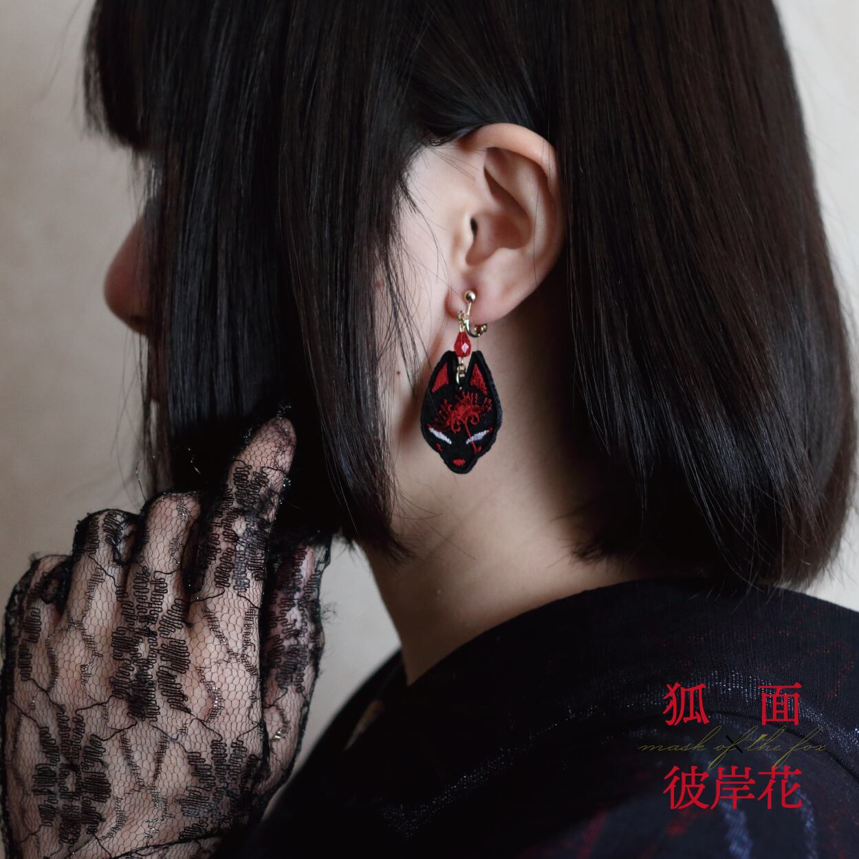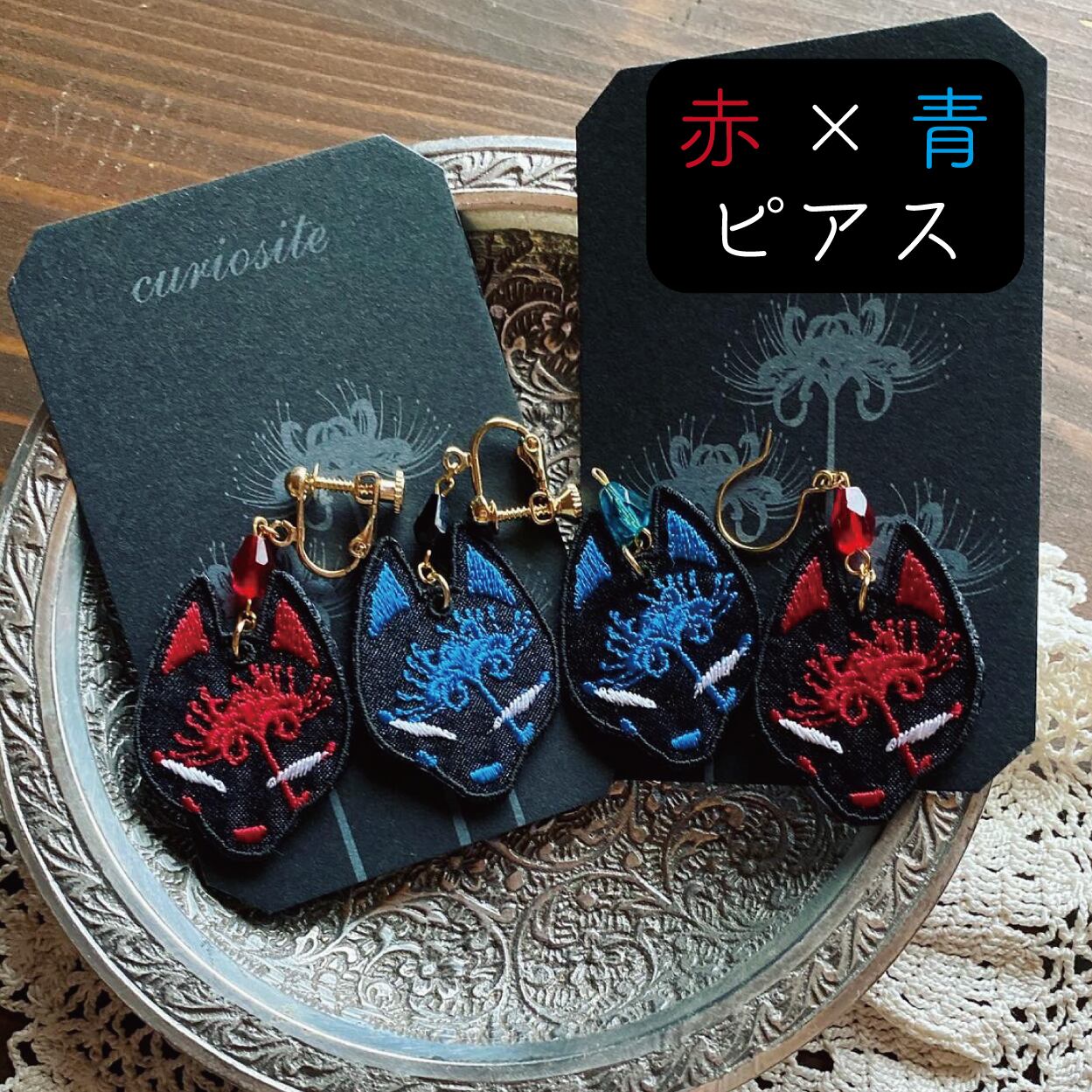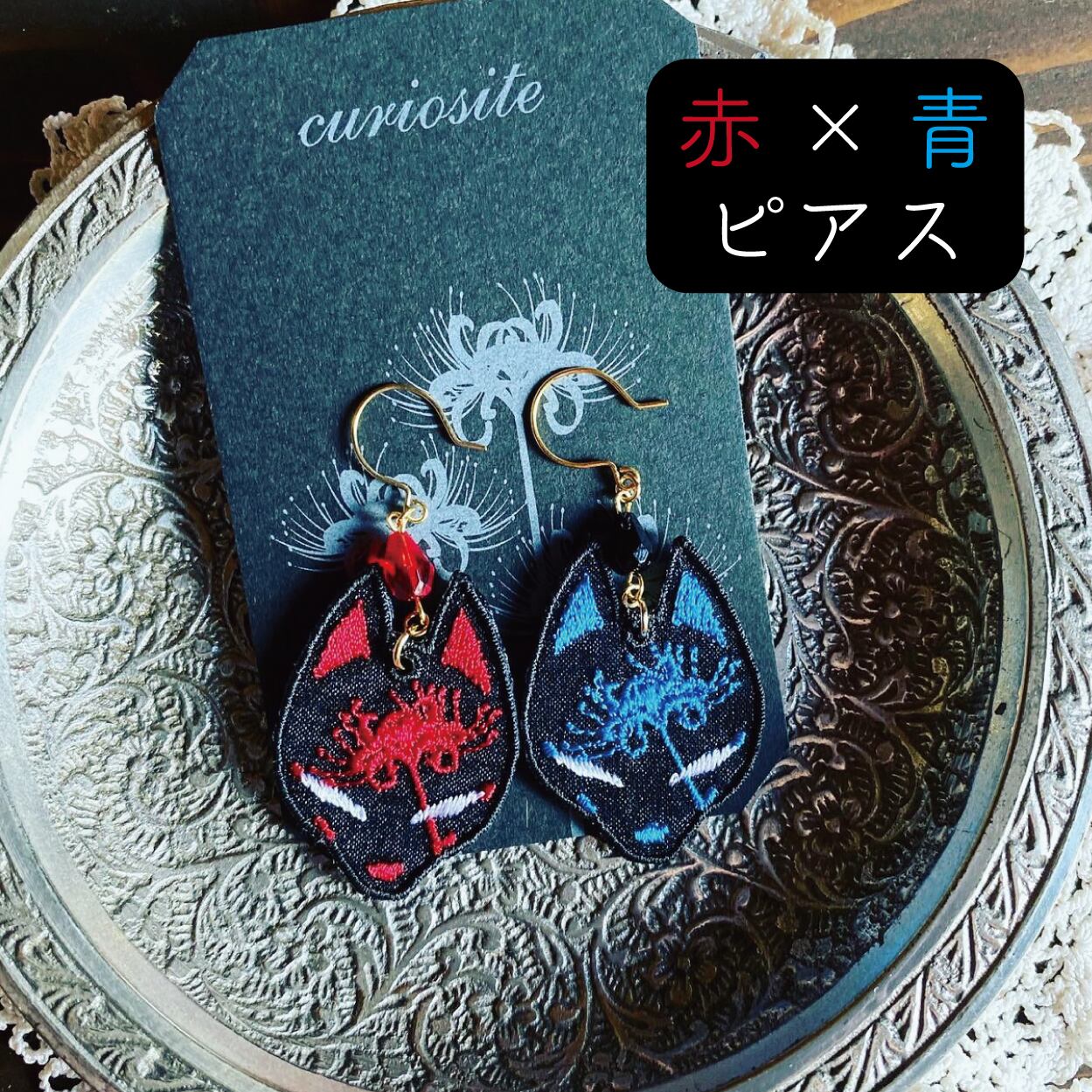 狐面と彼岸花の刺繍アクセサリーです