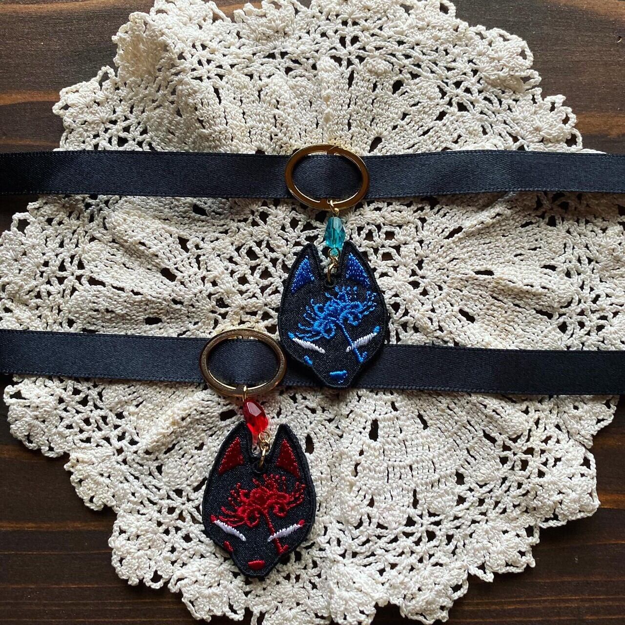 狐面と彼岸花の刺繍を使ったアクセサリーです。