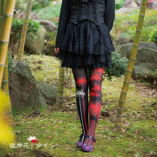 彼岸花ニーハイに続き、彼岸花柄のタイツが出ました。 黒と赤の世界でより華やかに咲く彼岸花が特徴的です。 冬場の寒い時期やニーハイはちょっと履けなかったという方にオススメです。 camera…Oさんmodel…ひんしさん 80デニール フリーサイズ