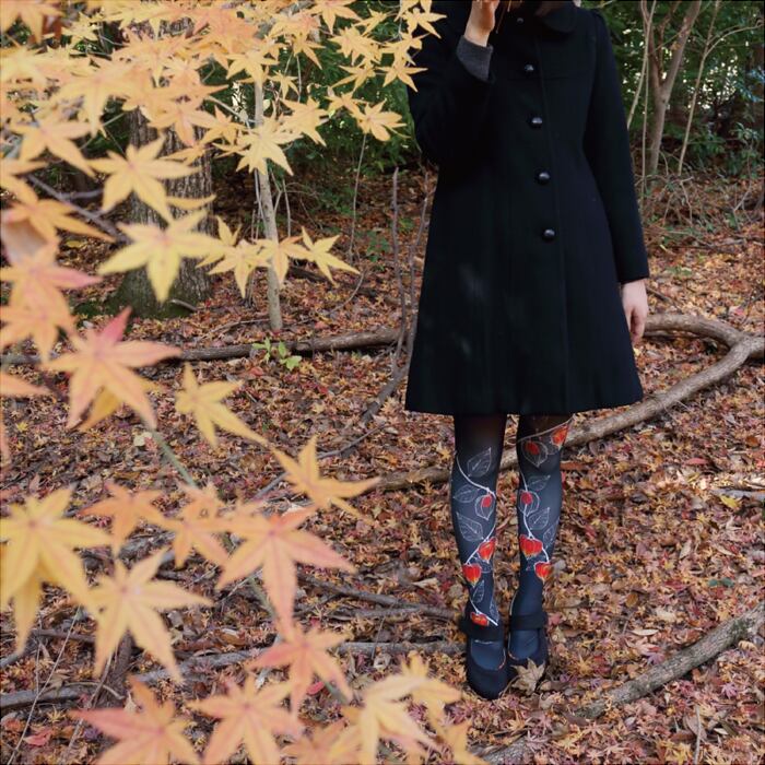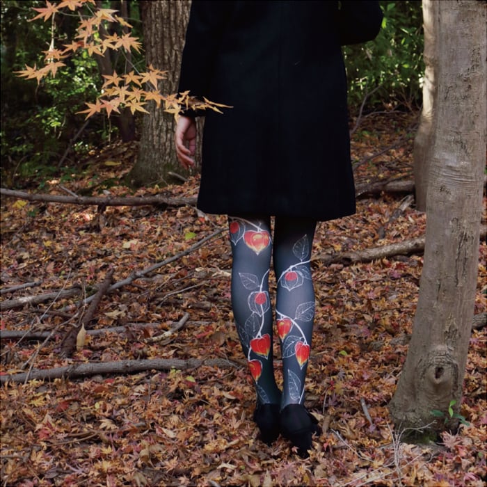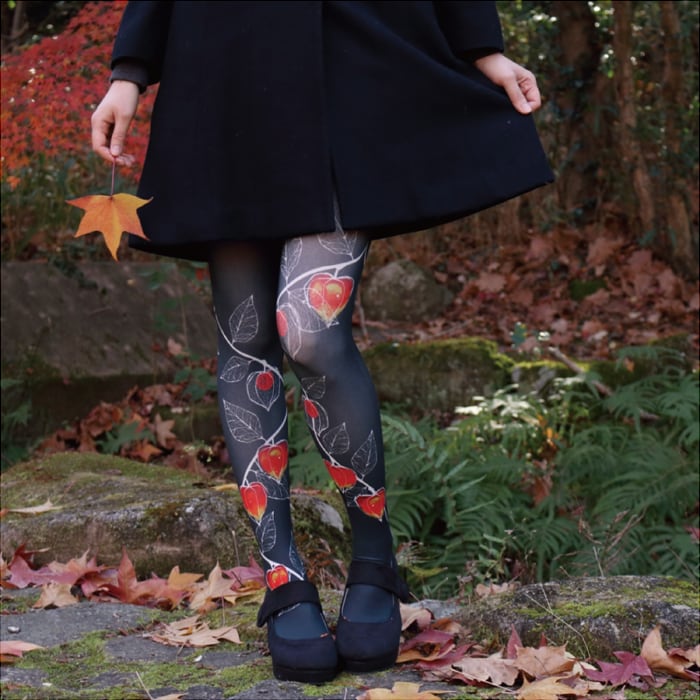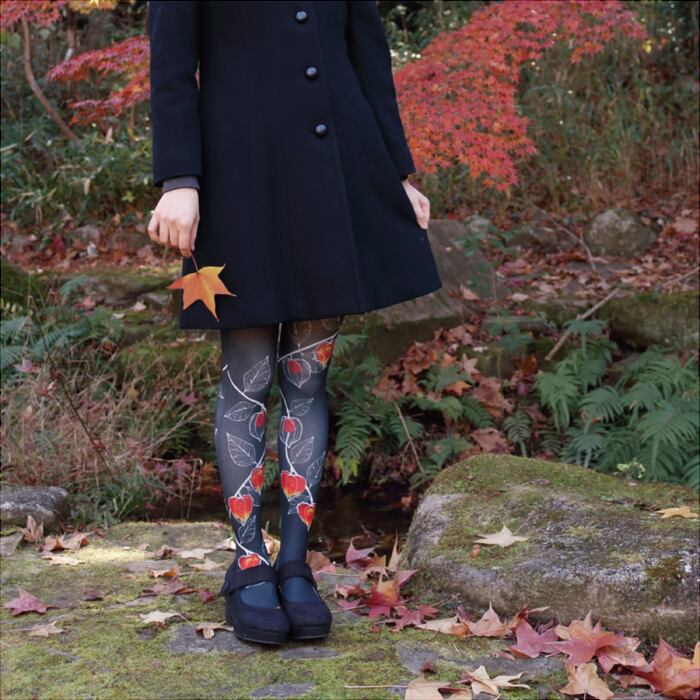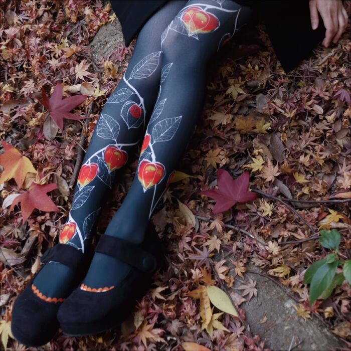 漂白をした鬼灯(透かし鬼灯)を足元にあしらったタイツです。