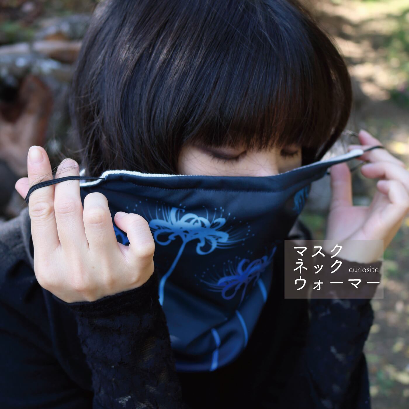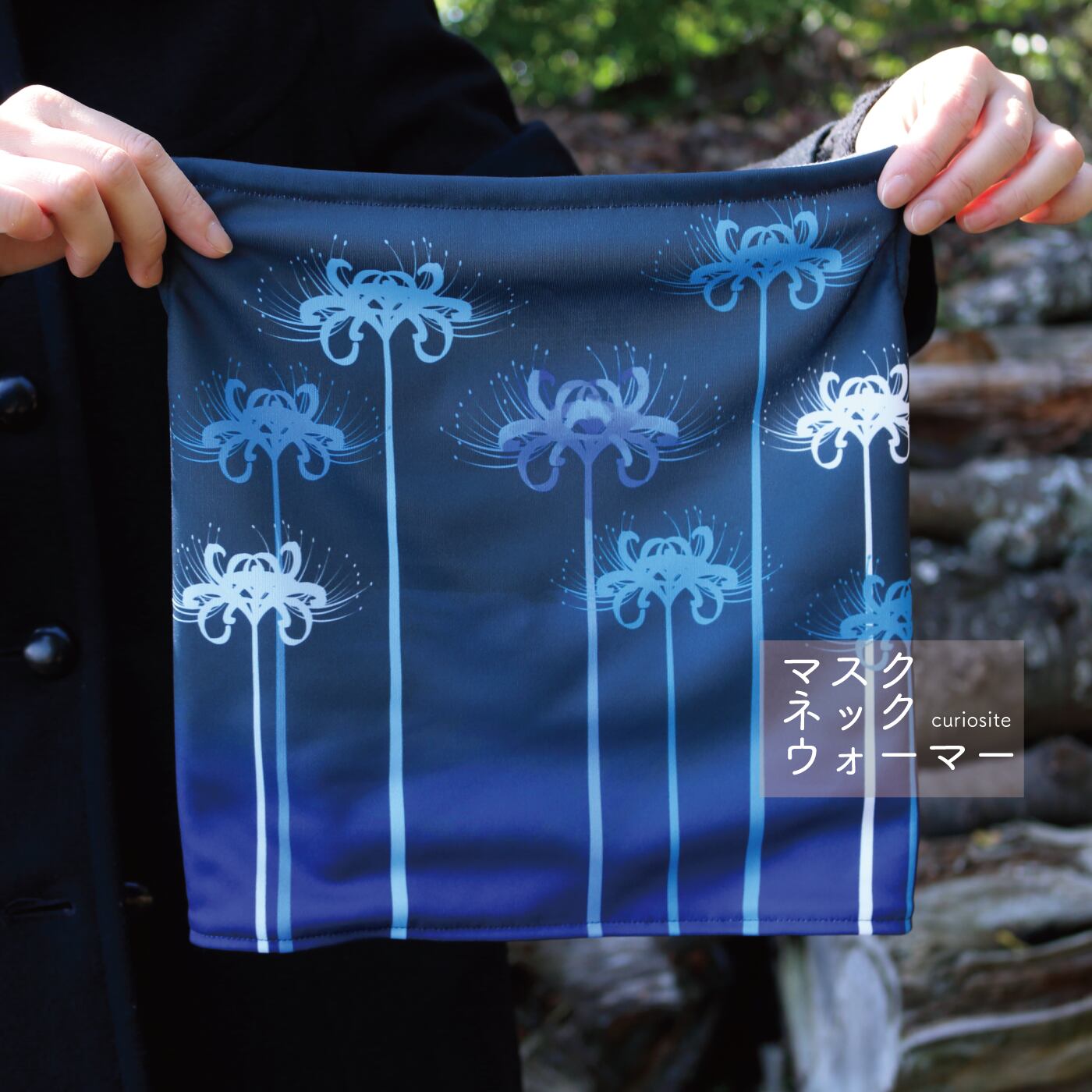 彼岸花の青色のマスクネックウォーマーです