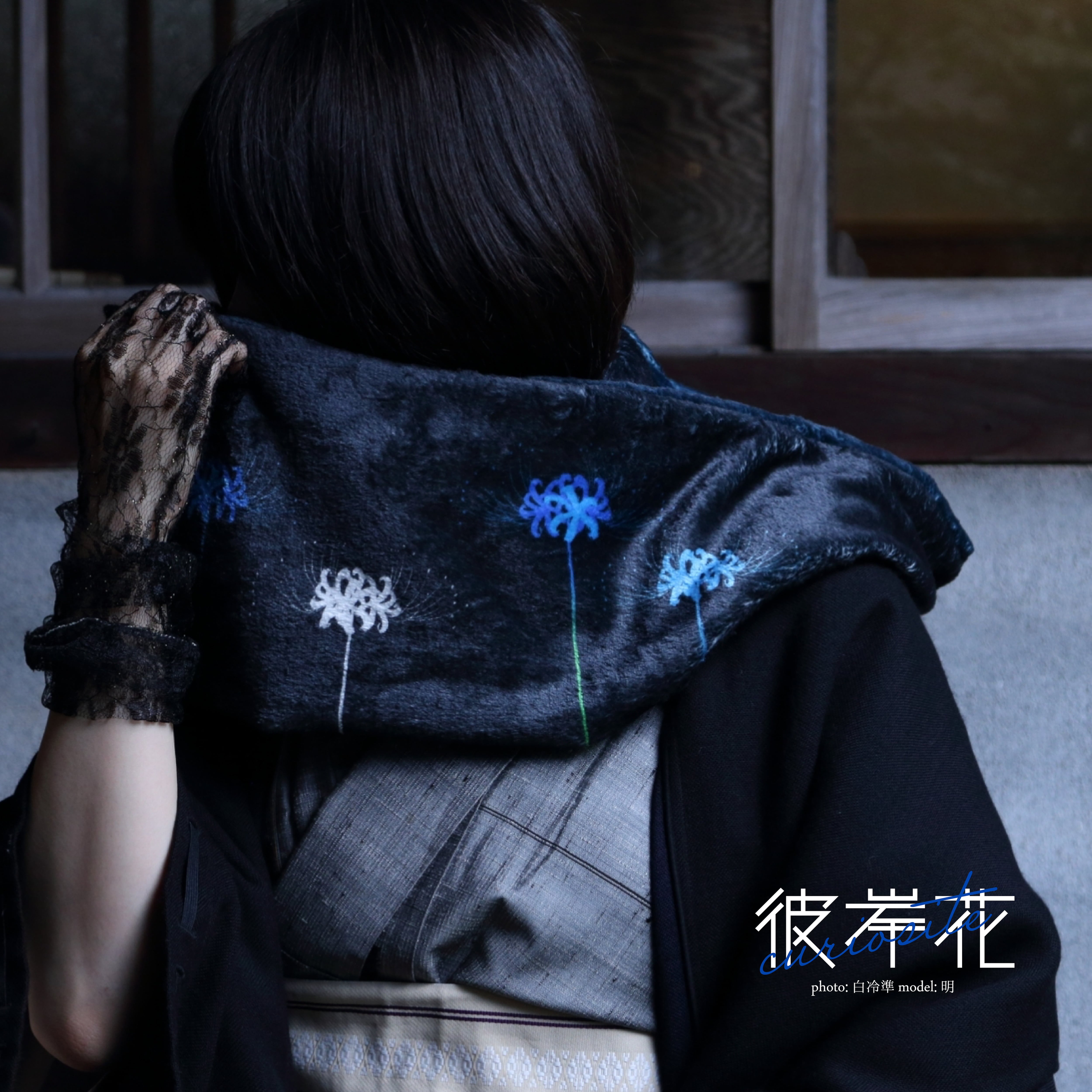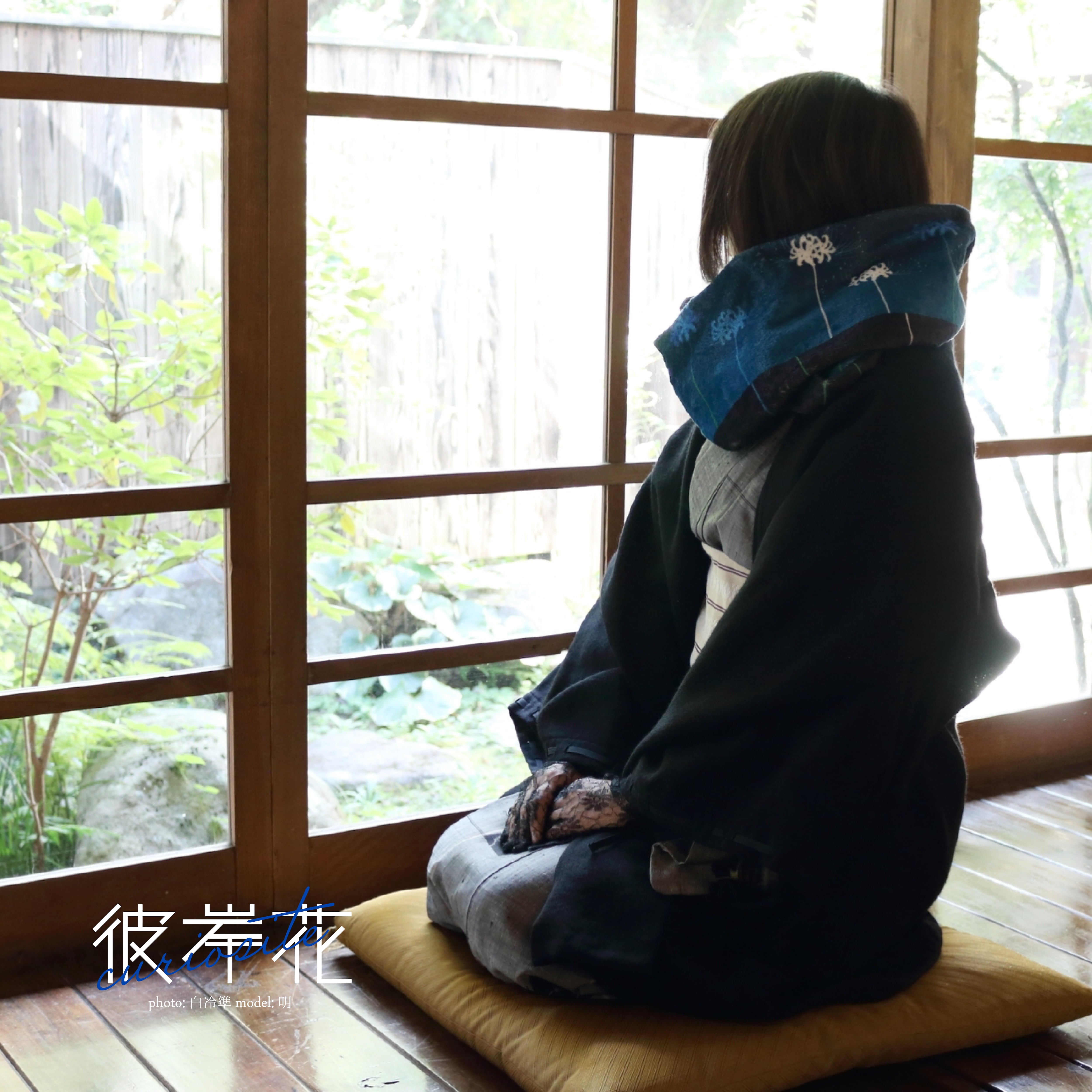 片面は繊細なタッチで描かれた、彼岸花とグラデーションでもう片面は黒地に青と白の彼岸花が描かれており、リバーシブルで使えます。